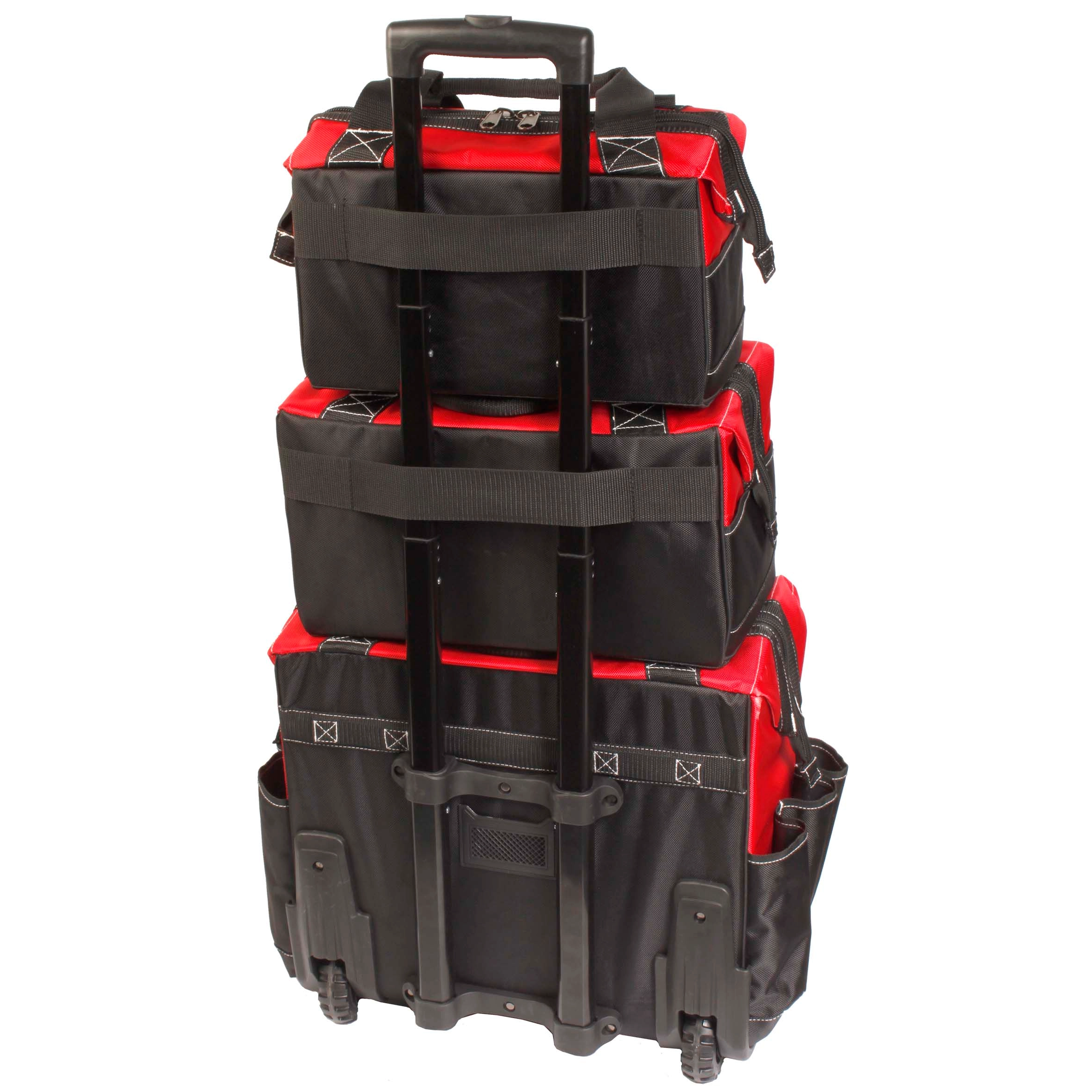 Water-resistant 3-piece rolling tool bag set for versatile storage: a large rolling bag, medium tote, and small pouch. Large bag has wheels for heavy tools; medium tote fits hand tools; small pouch stores parts. All bags feature durable fabric and reinforced zippers. Perfect for teams or professionals who need to sort tools by task—use together or separately. Keeps tools dry and organized on construction sites or service calls.